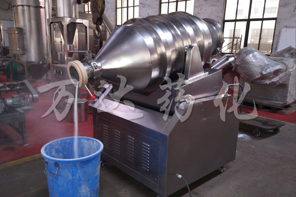 药用混合机主要由转筒、摆动架、机架三大部分构成。转筒装在摆动架上,由四个滚轮支撑并由两个挡轮对其进行轴向定位,在四个支撑滚轮中,其中两个传动轮由转动动力系统拖动使转筒产生转动,摆动架由一组曲柄摆杆机构来驱动,曲柄摆杆机构在机架上,摆动架由轴承组件支撑在机架上。