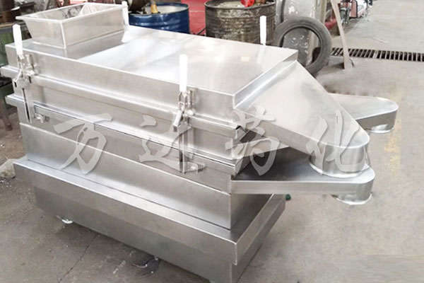 本机上部采用快拆式手柄,把整机连成一个整体,上盖全密封、有效防止物料在过筛时由于振动而产生粉尘飞扬。筛体下部安装振动电机,有效保证了物料的结构紧凑,下部采用弹簧减振,使整机在平稳状态下工作。下面底座采用可调式,可调节正在过筛时的筛面倾斜角度,根据物料特性以取得更佳过筛效果。